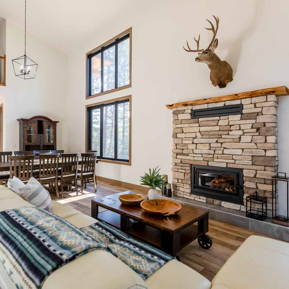 Inside, the home is designed for comfort and connection, featuring vaulted ceilings, a beautiful stone fireplace, and panoramic windows that flood the space with natural light. The open gourmet kitchen is fully equipped for family meals or entertaining friends.